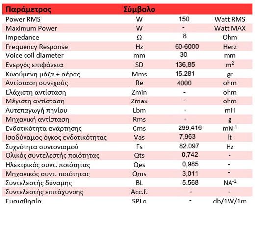Διάμετρος: 165mm (6,5'')Αντίσταση: 8 ohmΙσχύς: 150 Watt Απόκριση Συχνότητας: 60-6000HzΒάρος Μαγνήτη: 20 OzΕυαισθησία @1w,1m: 91dBΒάρος: 1,5 Kgr